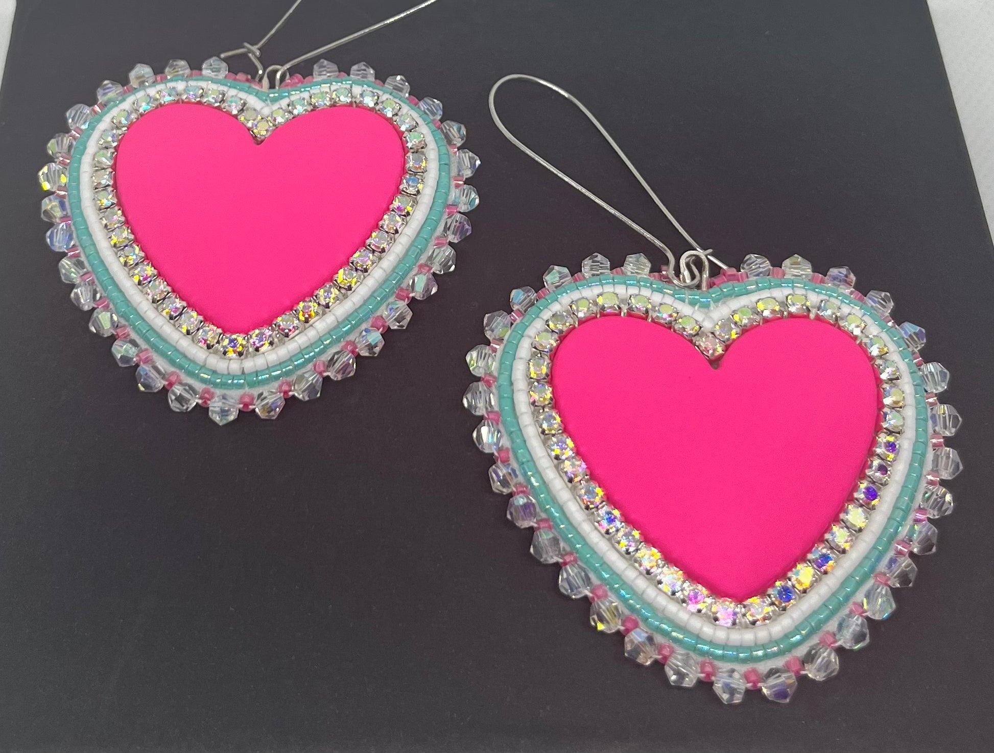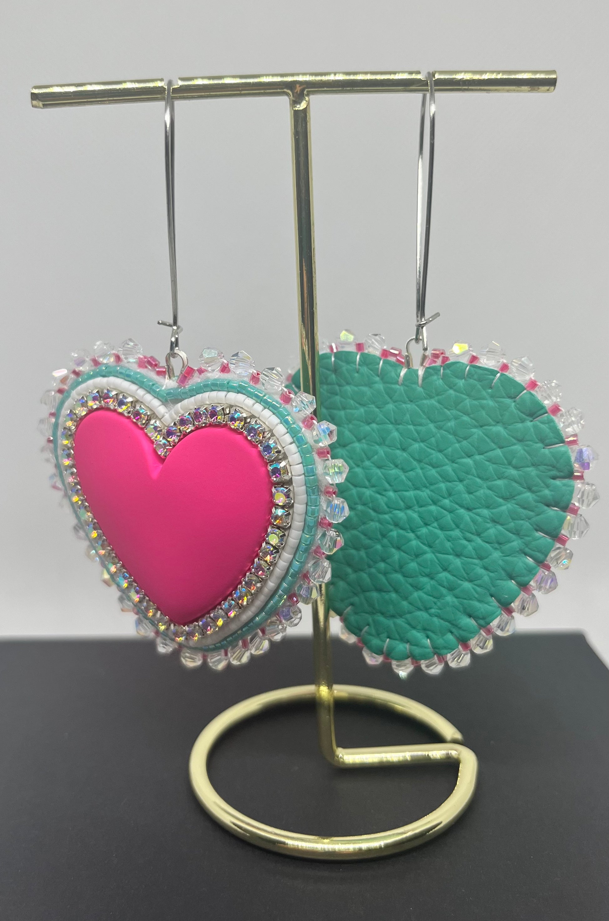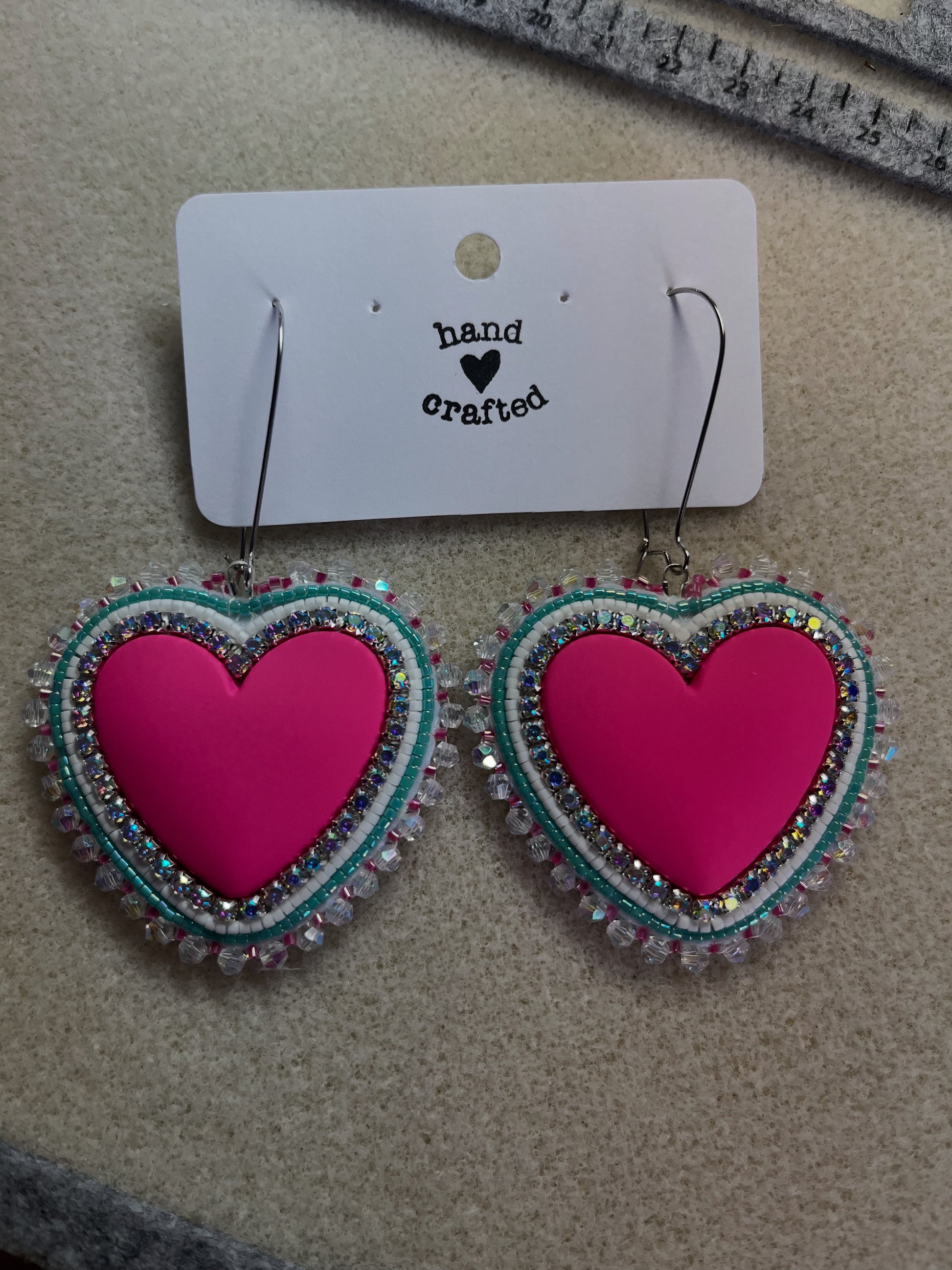 Add a touch of elegance with these handmade heart earrings. Featuring intricate beading and sparkling accents, these unique pieces are perfect for any occasion.